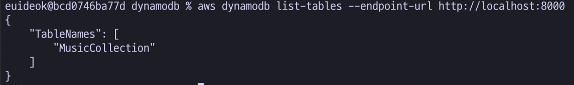 다음의 명령어를 통해 'MusicCollection'이라는 테이블을 생성해 봅니다. 이때 접속 엔드포인트를 localhost로 생성해 로컬의 DynamoDB에 테이블을 생성하도록 합니다. 엔드포인트를 로컬로 지정하지 않으면 aws configuration을 통해 설정한 계정의 DynamoDB에 테이블을 생성합니다.