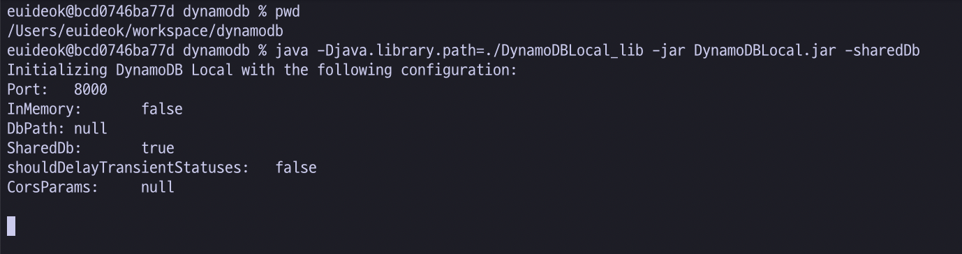 콘솔이나 터미널을 통해 다운로드 받은 DynamoDB 디렉토리로 이동합니다. 그리고 다음의 명령어를 실행해 DynamoDB를 Local에서 실행하시기 바랍니다.(단, 서론에서 말했듯이 콘솔에서 AWS 계정에 대한 configuration 작업이 선행되어 있어야 합니다.)
