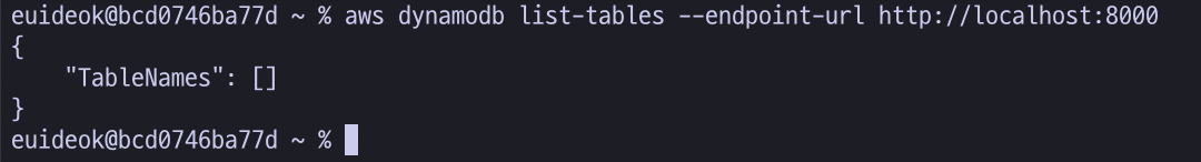 다음의 명령어를 통해 현재 실행된 로컬의 DynamoDB에 접속해 테이블 리스트를 가져와 보도록 합니다.