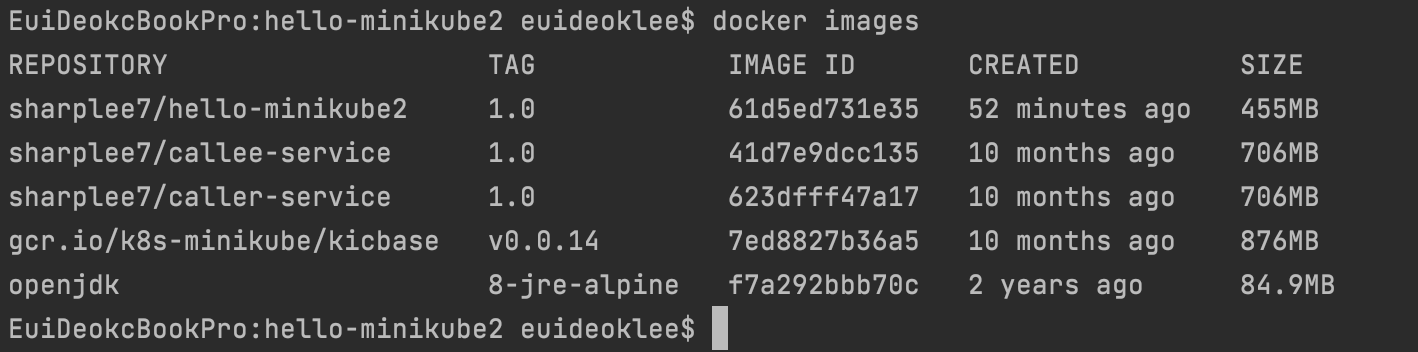e.g. sharplee7/hello-minikube2:1.0 (여기서 sharplee7은 docker-hub의 내 계정명이다.)