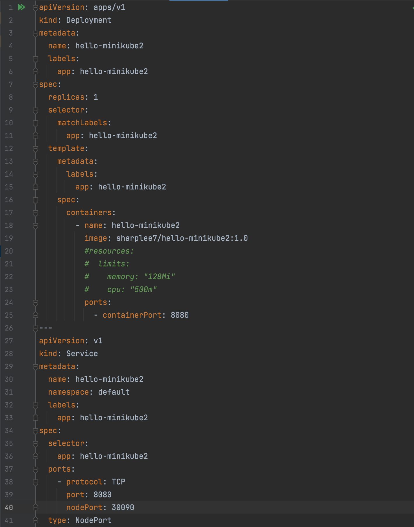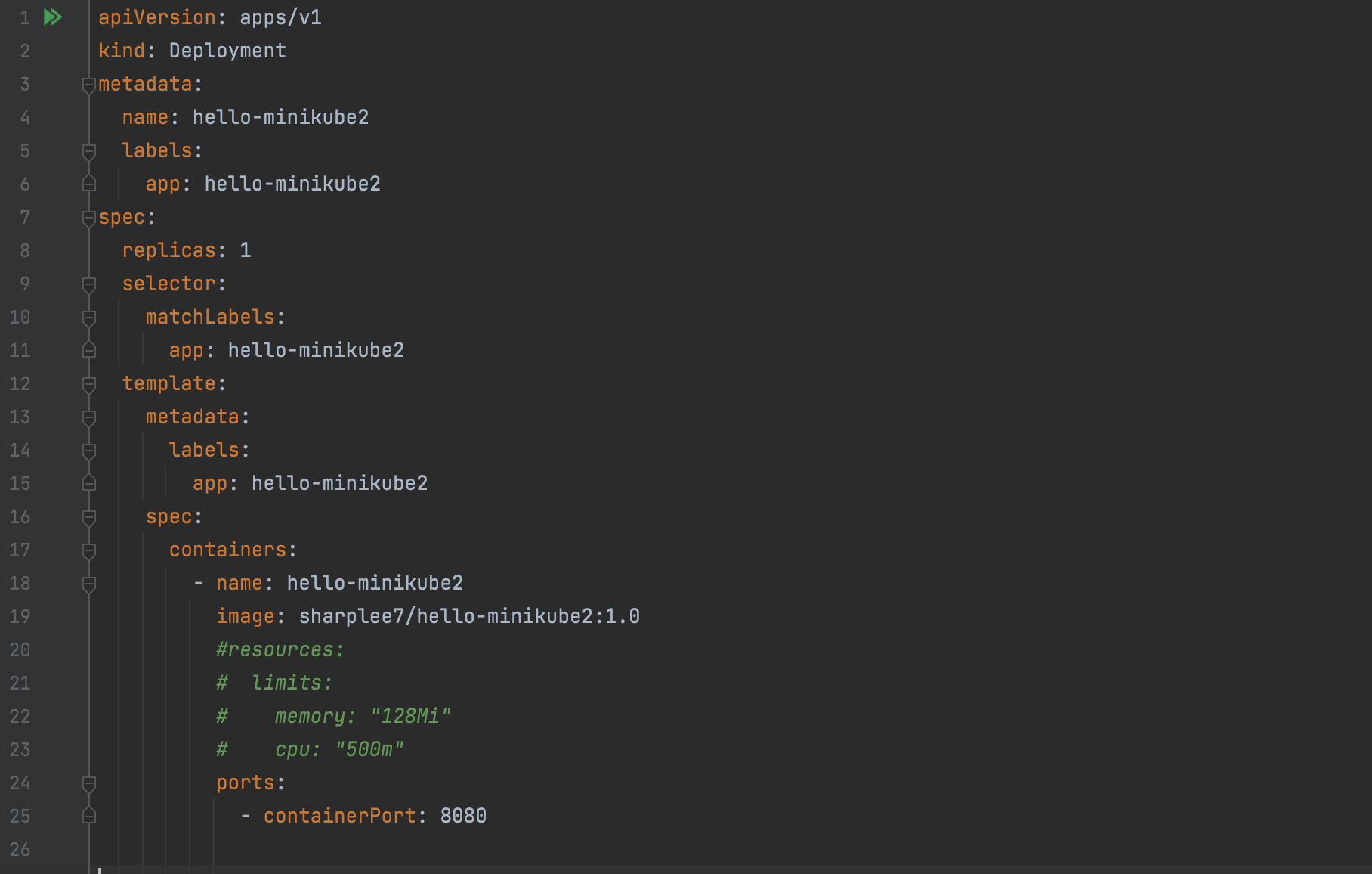 - Minikube에 배포를 위해 hello-deployment.yaml 파일을 작성한다.