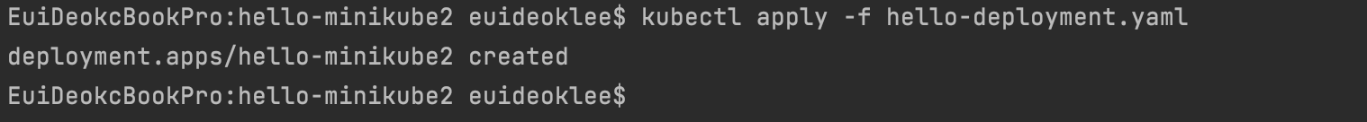 - kubectl 명령어를 이용해 Minikube 클러스터에 hello-minikube2 이미지를 배포한다.