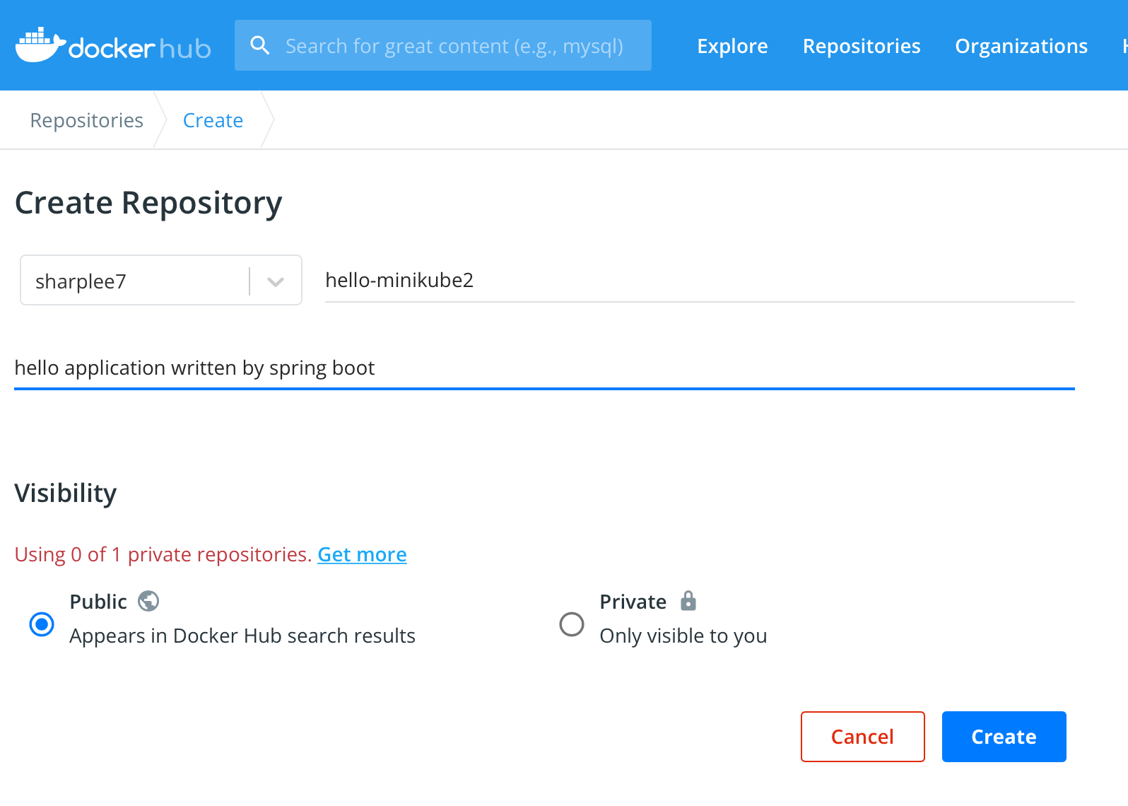 이 예제의 Repository명은 hello-minikube2라는 이름을 사용할 예정이다.