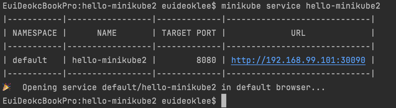 우리가 nodePort를 통해 생성한 hello-minikube2 서비스에 접근하는 IP 및 Port를 아래의 명령어를 통해 확인해 보도록 한다.