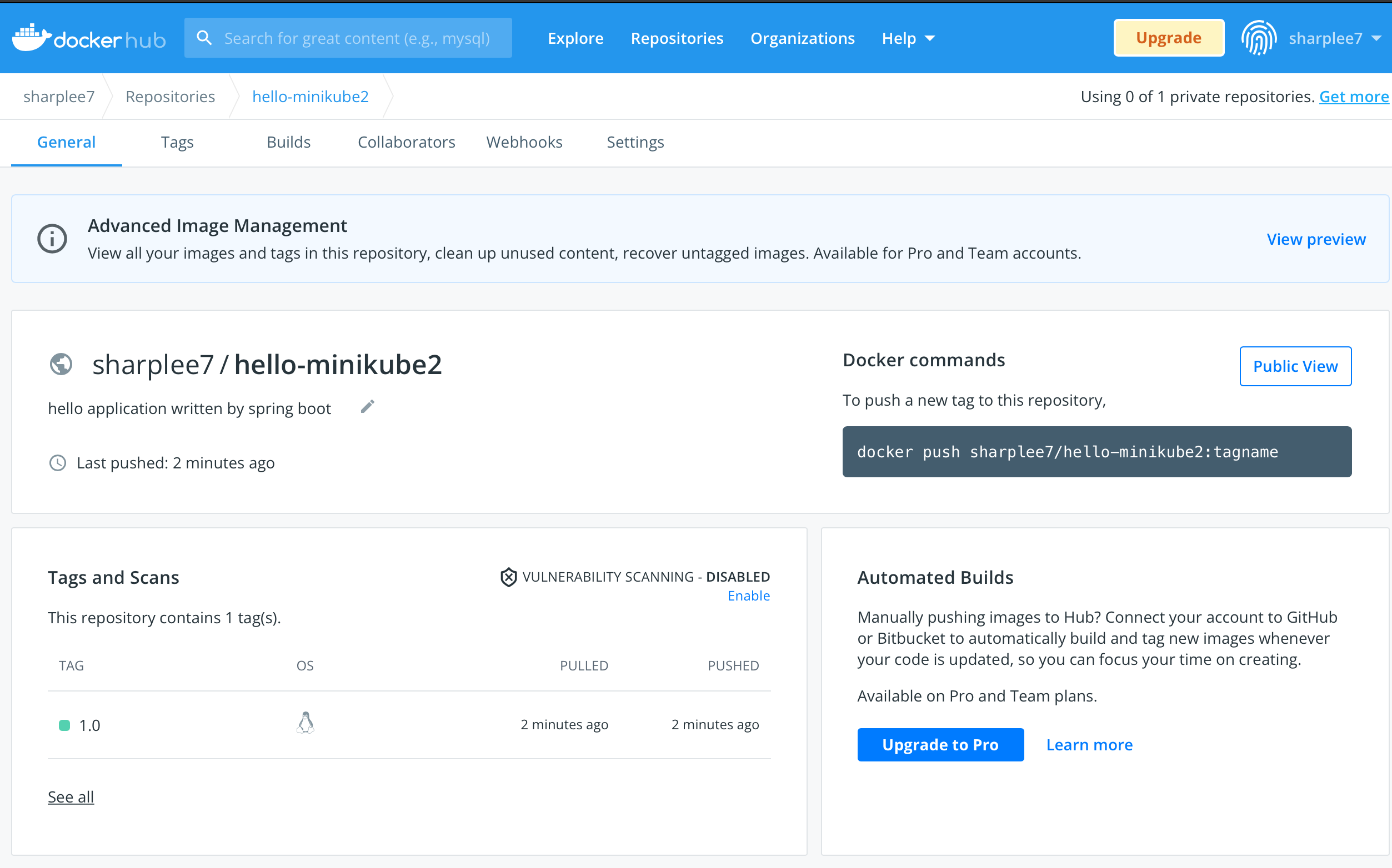 - docker push 명령어를 통해 5. 에서 생성한 sharplee7/hello-minikube2:1.0 이미지를 docker hub의 Repository에 push 한다.