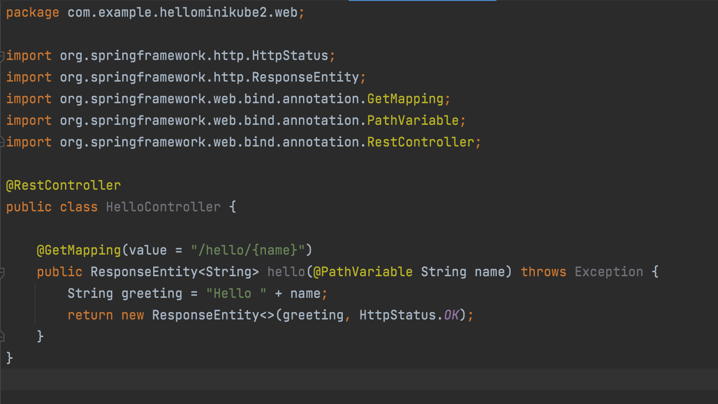 Controller 파일은 HelloController.java 파일을 하나 만들고 아래와 같이 심플하게 작성하도록 한다.