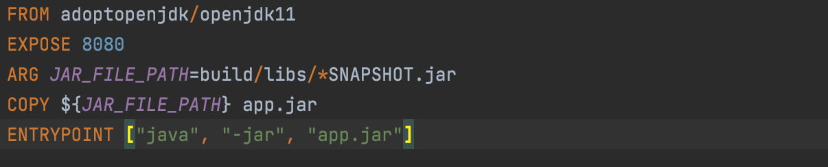 - FROM - Docker Image를 만들 베이스 이미지, 예제는 openjdk 11버전 이미지를 이용해 베이스 이미지를 만들었다.