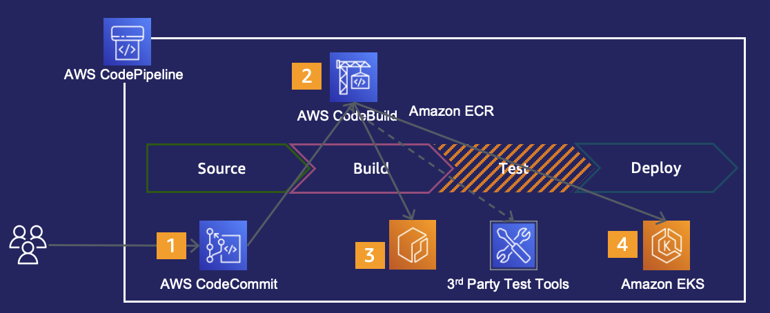 개요 현재까지(22년 4월) AWS의 CodeDeploy는 EKS 배포를 지원하지 않는다. 따라서 명령어 기반 build 툴인 CodeBuild를 통해서 배포를 하던지 별도의 서드파티 제품과 연동해야 EKS 배포가 가능하다. 여기서는 CodeBuild를 통해서 EKS배포를 하는 방법에 대해 알아 보겠다. * 이 예제를 성공적으로 따라해 보기 위해서는 AWS의 CodeCommit이 구성되어 있어야 하며, ECR, EKS등 이미 배포 환경이 만들어져 있어야 한다. 다만 CodeBuild의 작동 방식만 참조를 할때는 해당 구성이 없다고 하더라도 상관없다. 파이프라인 구성할 파이프라인은 아래의 아키텍처에서 볼 수 있듯이 AWS Code Series로 구성할 예정이며 파이프라인 관리 -> CodePipeline,..